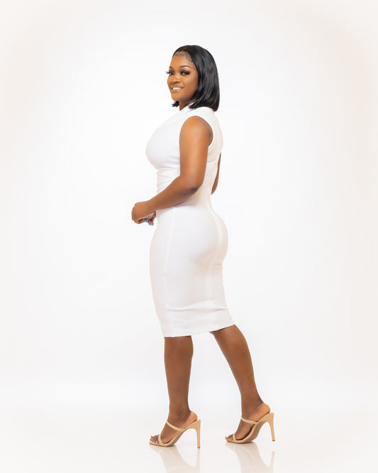 CHOLE WHITE V-NECK DRAPED BANDGE MIDI DRESS