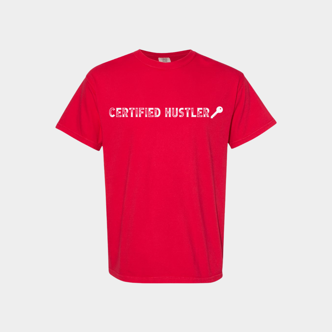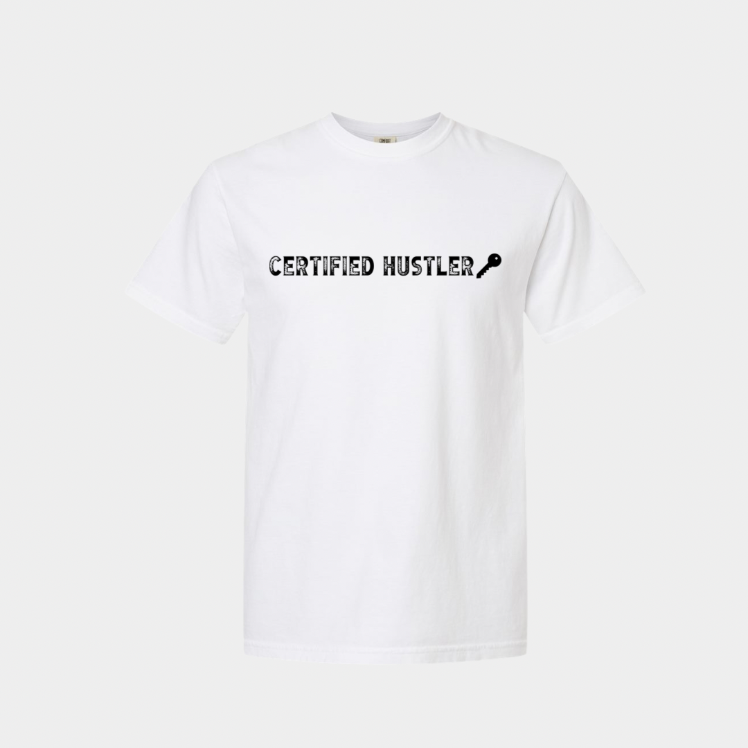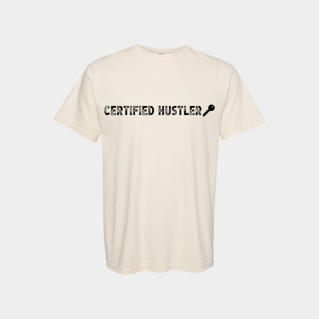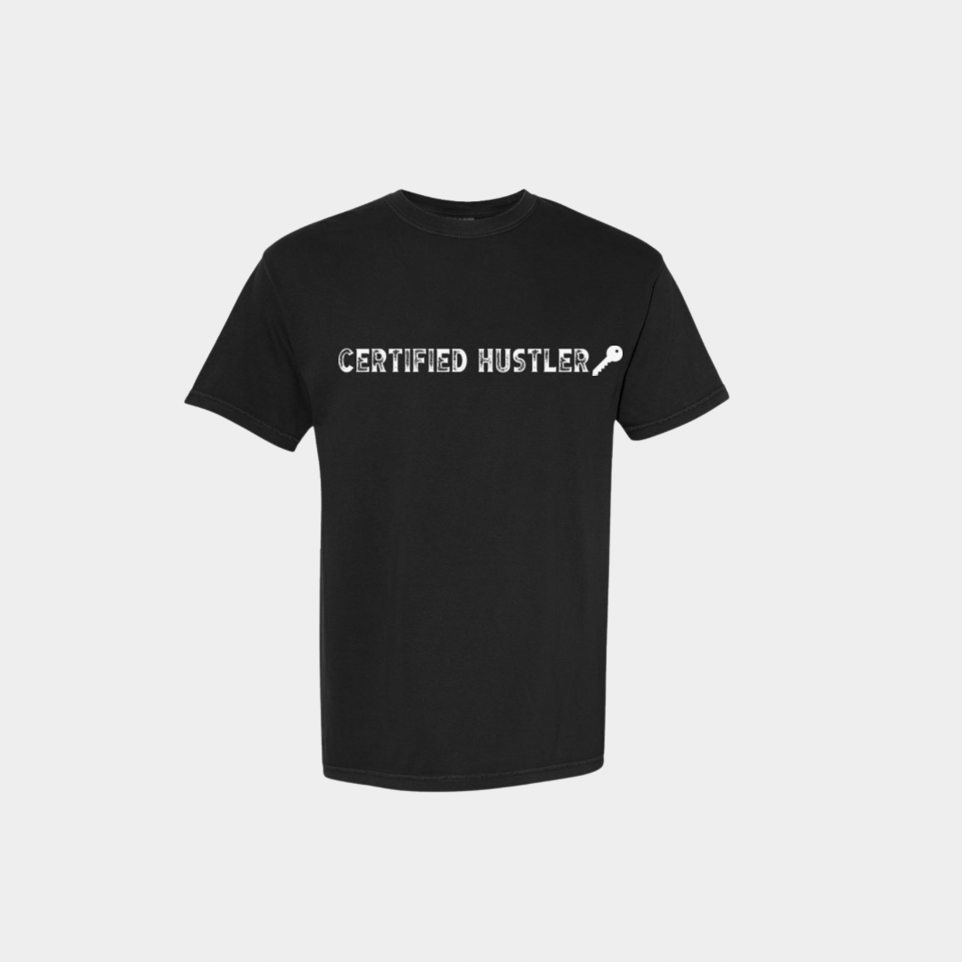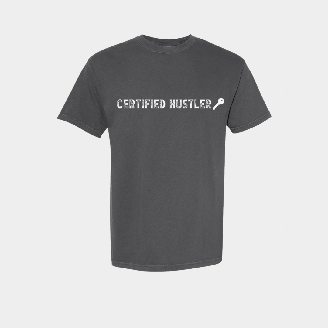 This t-shirt features a bold, minimalist design with the words “CERTIFIED HUSTLER” in a clean, impactful font across the chest. The text is accompanied by a small, subtle key icon, emphasizing a sense of empowerment and unlocking potential. The shirt is in a solid, neutral charcoal gray, giving it a versatile, timeless appeal. Its casual, unisex fit makes it perfect for those who embrace their hustle with confidence and style, offering both comfort and a strong statement of motivation.
