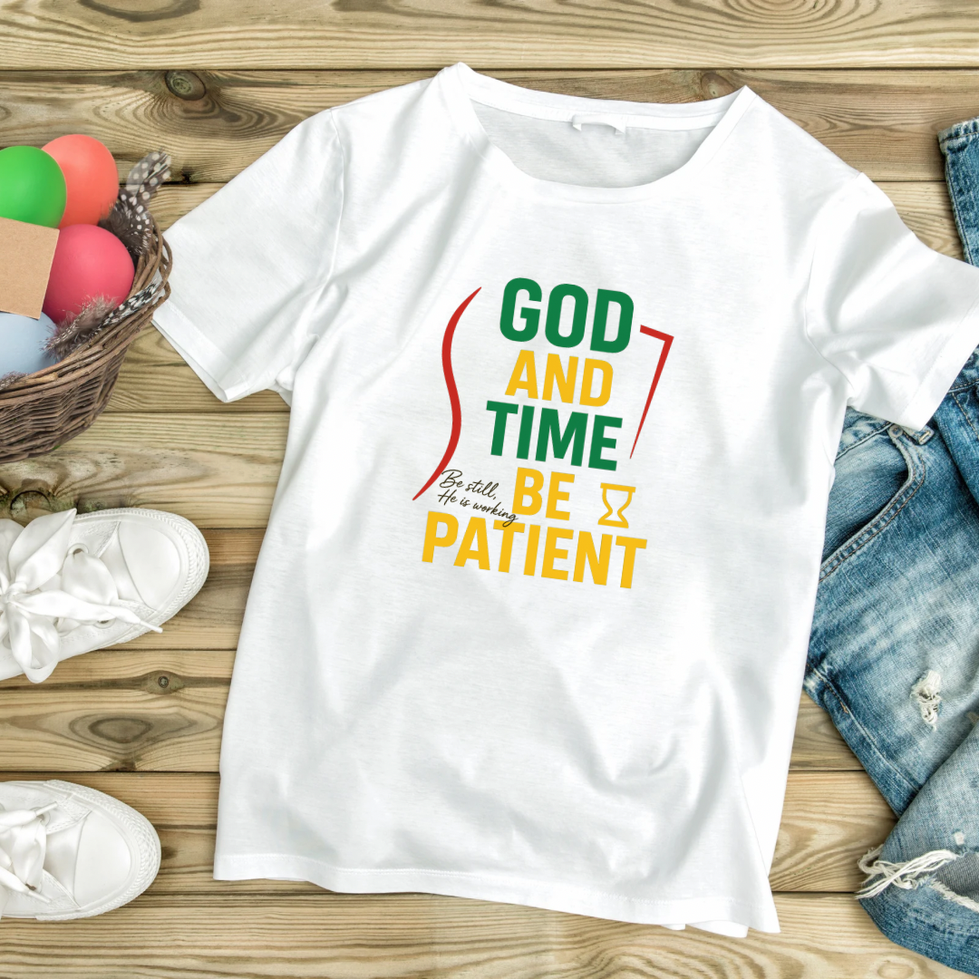Stay grounded in faith and fashion with our “God and Time” T-shirt a bold reminder that patience and trust go hand in hand. Featuring the powerful message “Be still, He is working. Be patient”, this tee blends spiritual encouragement with everyday style. Perfect for anyone walking by faith, not by sight. Made from soft, breathable cotton and designed with vibrant lettering that pops, this shirt is ideal for daily wear, church events, or quiet moments of reflection. Pair it with jeans or dress it up either way, you’ll wear your faith proudly.
