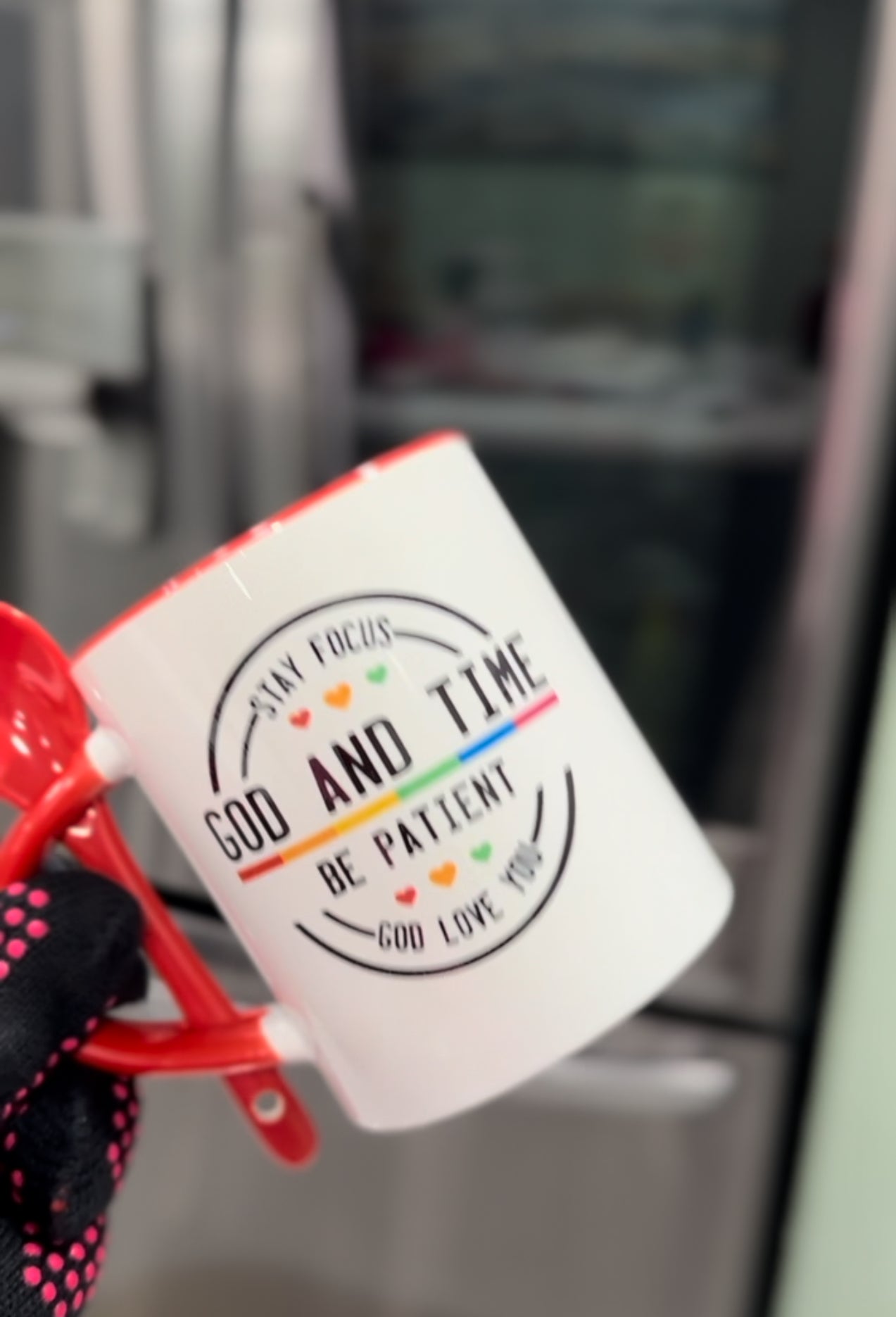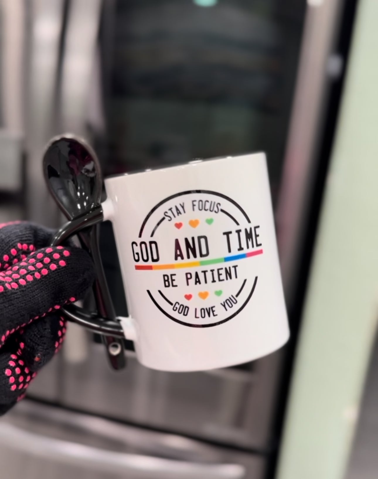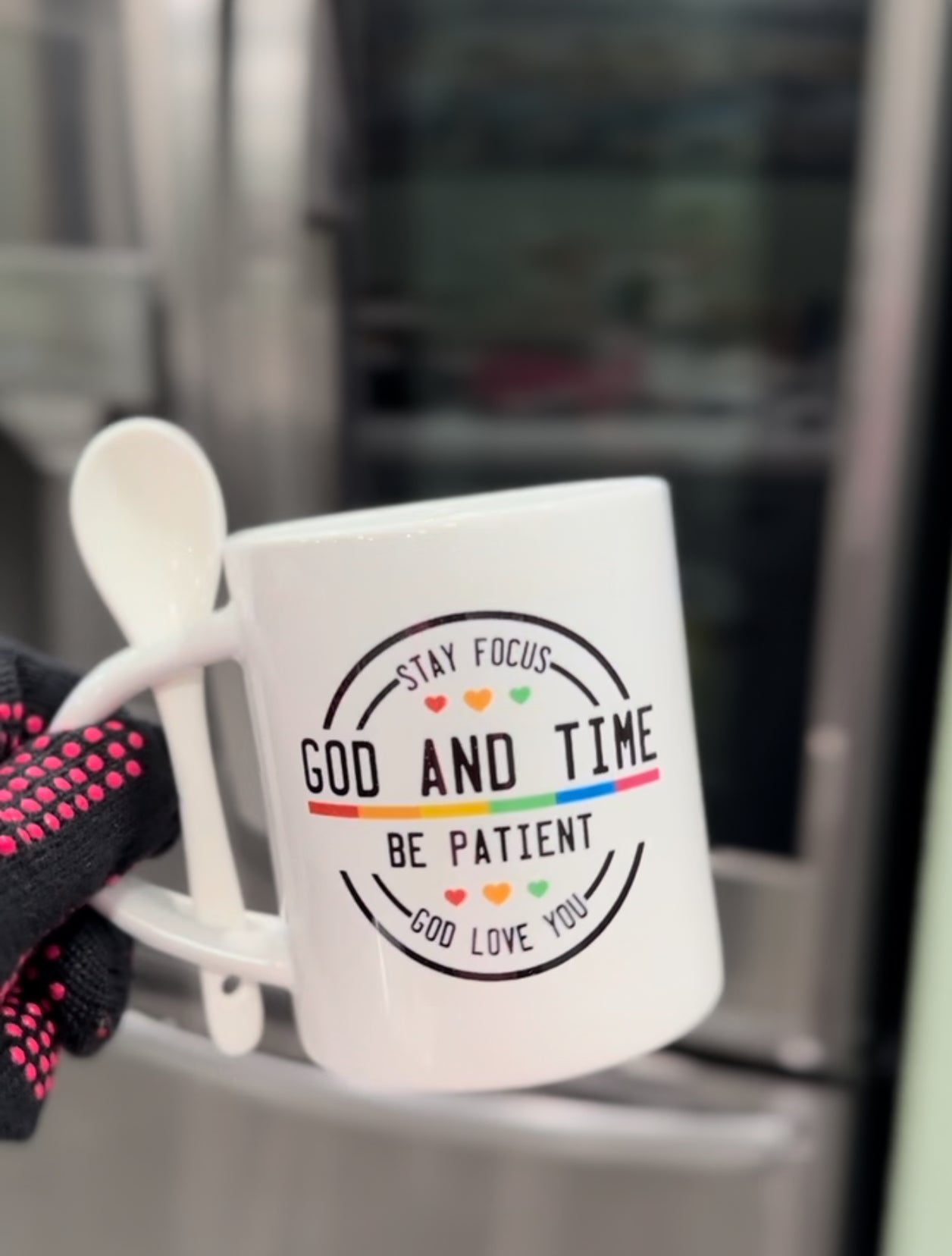 Introducing our “God and Time” Inspirational Mug – a perfect reminder of patience, faith, and love. This 11oz white ceramic mug features an inspiring message to “Stay Focused,” “Be Patient,” and trust in “God and Time.” Accented with gentle heart icons and a subtle color stripe, it adds a touch of warmth and positivity to your daily routine. Complete with a matching spoon that fits conveniently in the handle, this mug is perfect for stirring in a little extra sweetness to your favorite drink. Embrace each day with this meaningful design, reminding you that God loves you and that patience is key to all things.