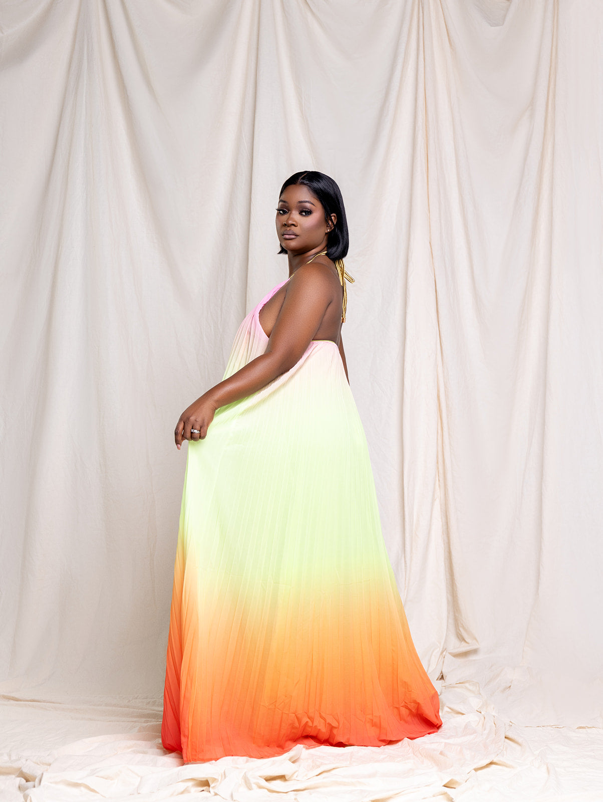 Step into elegance with our Radiant Sunset Pleated Maxi Dress. This stunning piece features a captivating gradient that transitions from a soft pastel pink at the top to a vibrant orange at the hem, reminiscent of a breathtaking sunset. The dress is crafted from lightweight, flowy fabric that drapes beautifully, creating a graceful silhouette that moves with you.