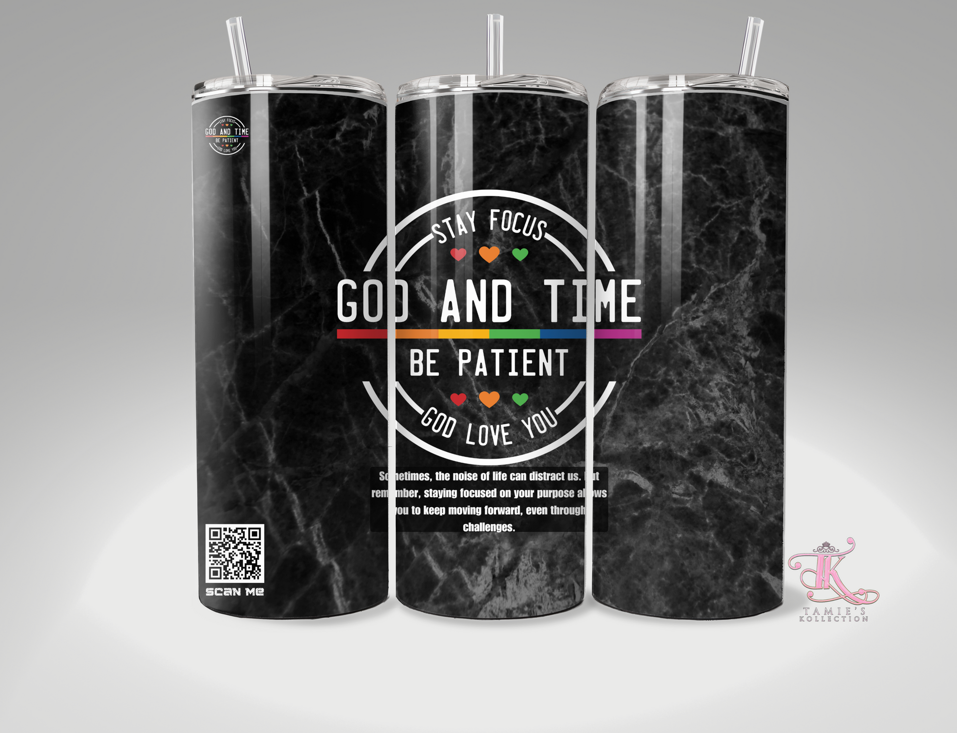 This sleek, marble-patterned tumbler carries a powerful message of faith and patience. With the central phrase “Stay Focused – God and Time – Be Patient” prominently displayed, this tumbler serves as a daily reminder to trust in divine timing and to remain grounded in the midst of life’s distractions. Accented with colorful hearts, the tumbler reflects positivity and warmth. The text at the bottom encourages readers to stay focused on their purpose, continuing to move forward even through challenges. A QR code is conveniently added for easy access to additional information or a special message, combining modern design with spiritual wisdom. Perfect for those seeking both style and inspiration, this tumbler is a great companion for daily motivation.