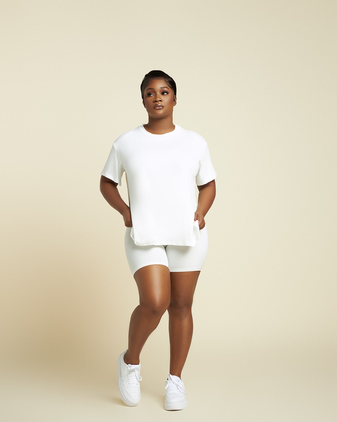 Stay comfortable and fashion-forward with this Two Piece White Biker Short Set. It is crafted from ultra soft fabric for all-day comfort and ease of movement. Featuring a loose fit that is easy to slip on and off, it's perfect for everyday wear. Look and feel your best with this stylish set